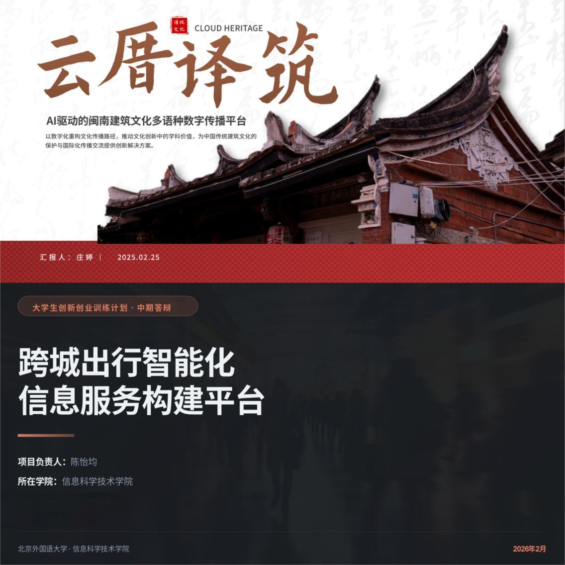 2月25日下午,信息科学技术学院在国际大厦812室举办大创项目中期评审会,学院党总支书记梁野、专业教师乔利强、辅导员赵韵怡担任评审。本次参与中期评审的大创项目共两项。市级项目“云厝译筑(CloudHeritage):AI驱动的闽南建筑文化多语种数字传播平台”聚焦传统文化数字化传播,贴合国家文化发展与国际人文交流相关战略,项目创新点鲜明,整体推进成效突出;校级项目“跨城出行智能化信息服务构建平台”瞄准民生出行痛点,技术落地性强,...